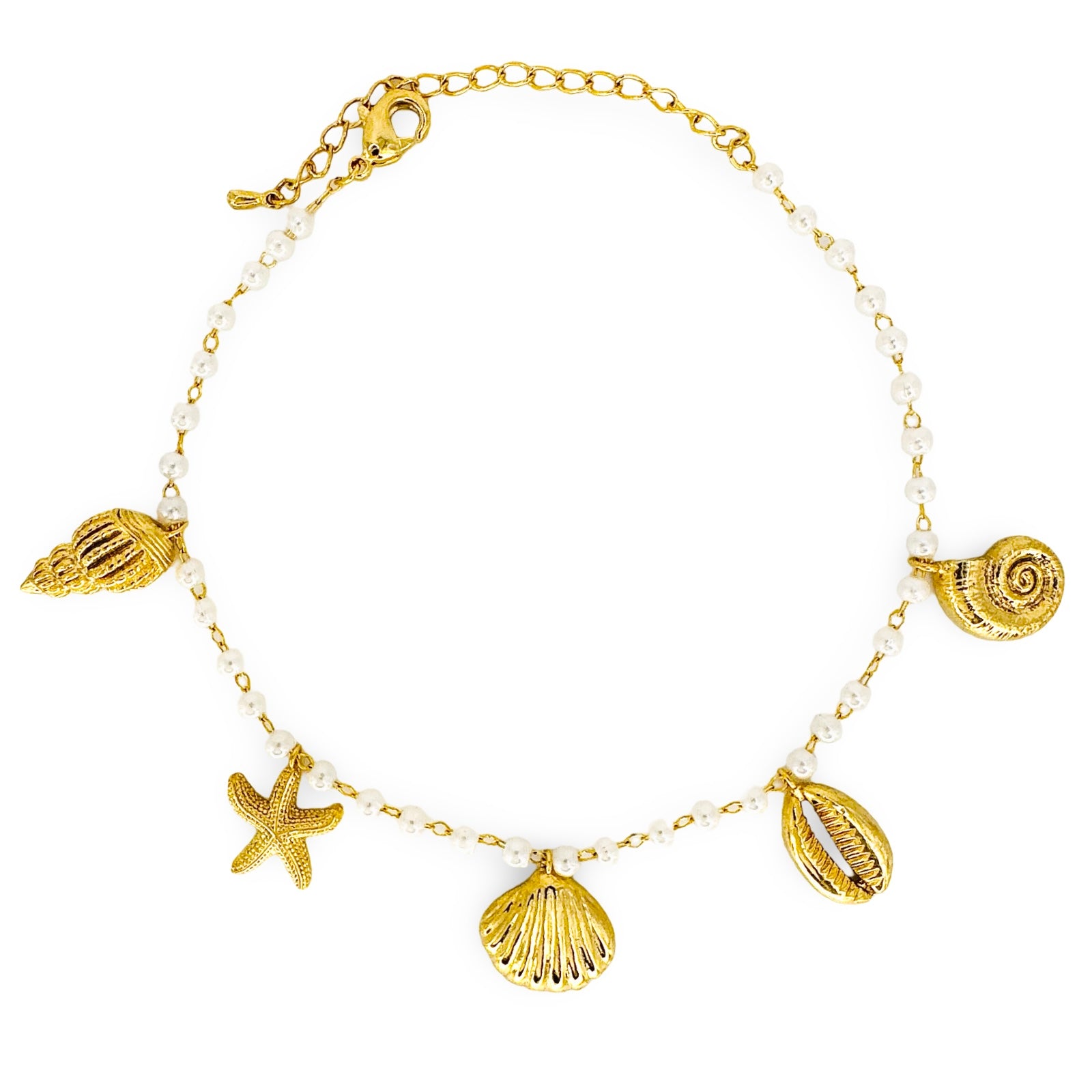 Conch, Starfish, Clamshell, Cowrie, & Nautilus Pearl Beaded Charm Bracelet