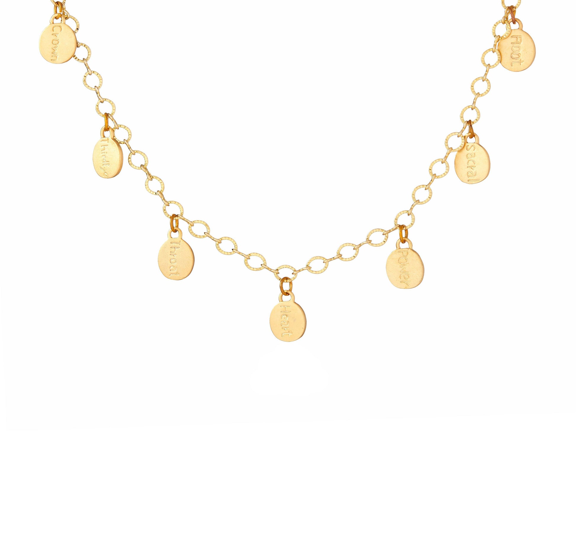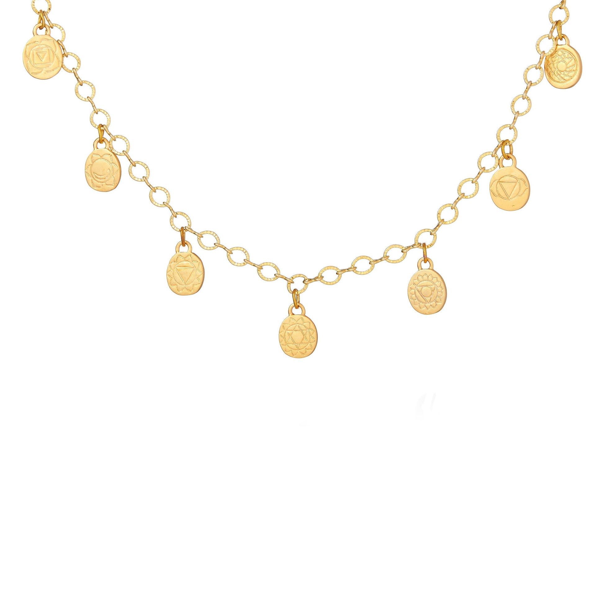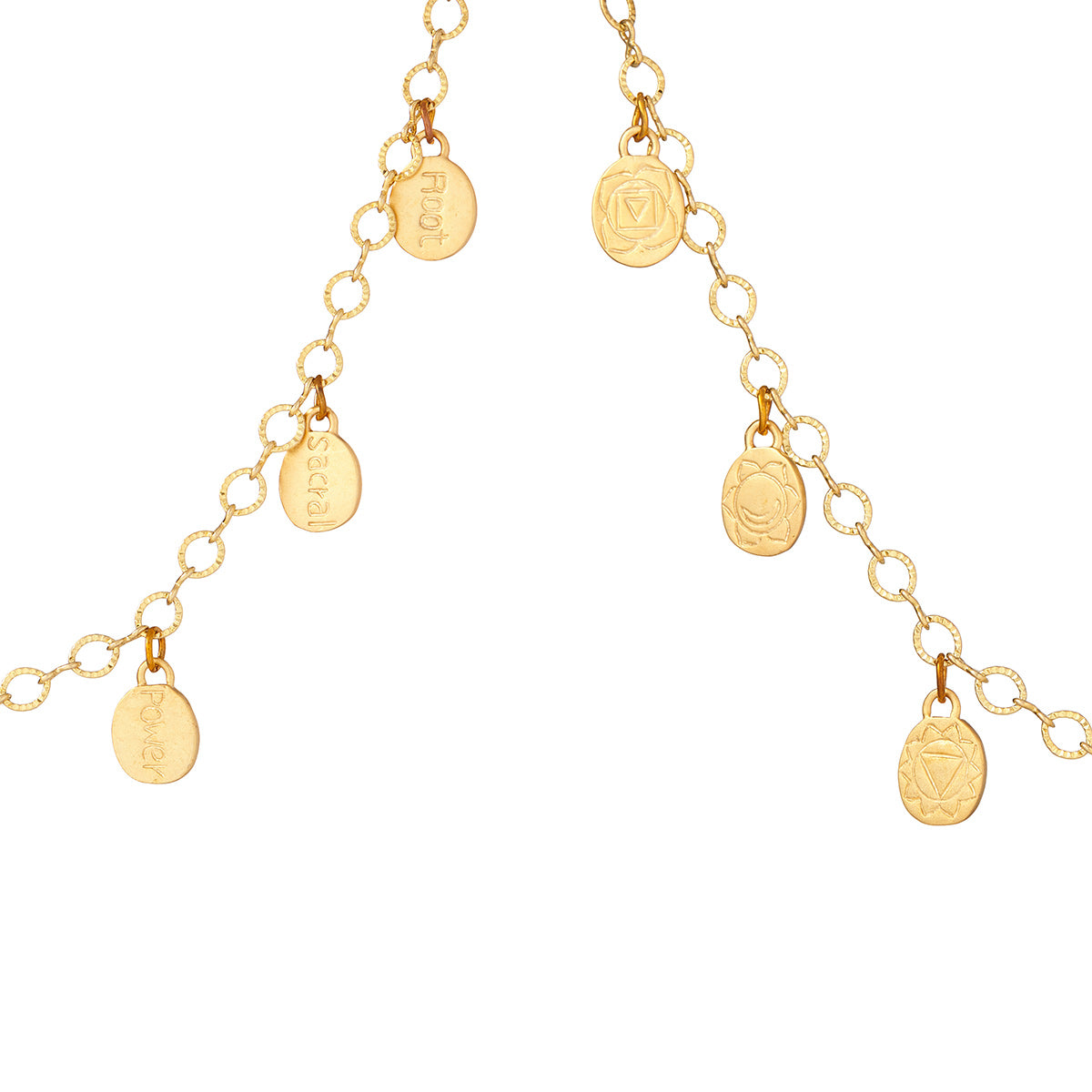 18k Gold plated Brass Charms hang from 18k Gold Plated Brass chain. Each charm has a different Chakra symbol on the front and the names of each Chakra on the back.